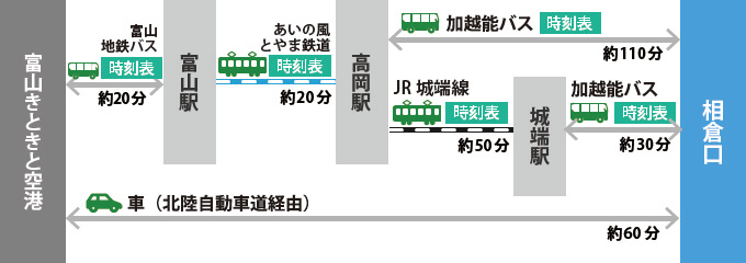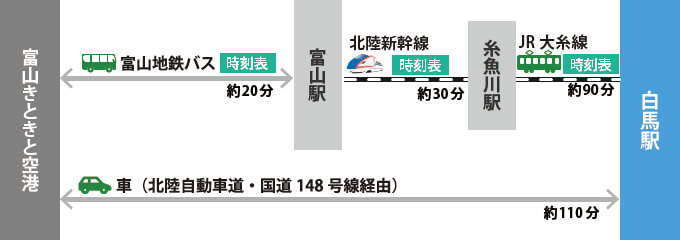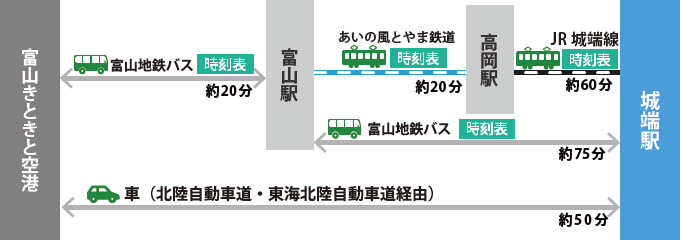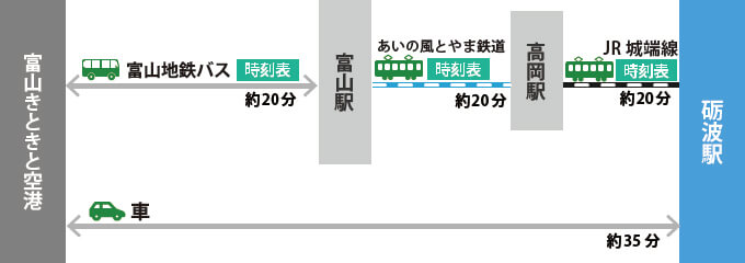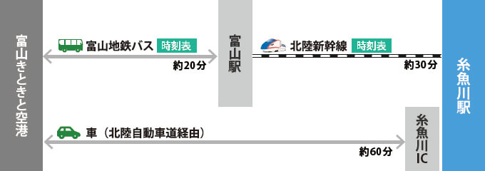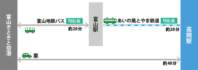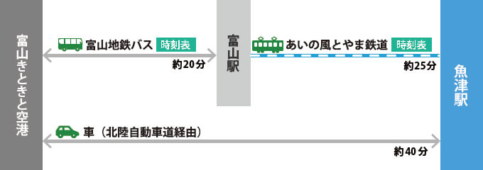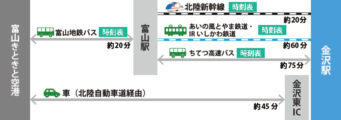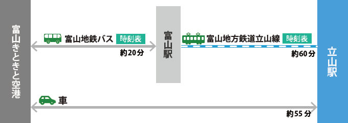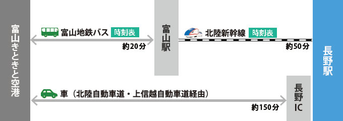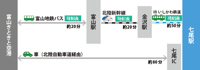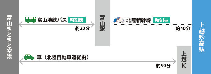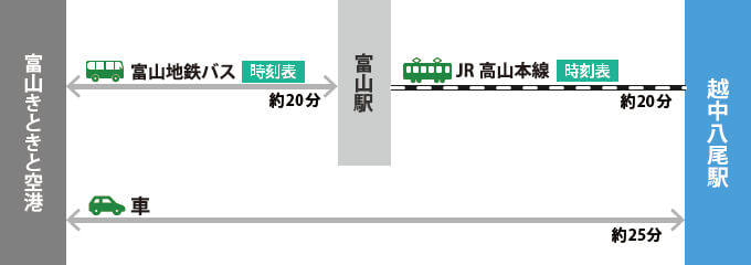 富山I.Cからお車で約5分、JR富山駅からバスで約20分と便利な立地でアクセスしやすい富山きときと空港。無料駐車場を1,531台分完備しており、お手軽に安心してご利用いただけます。